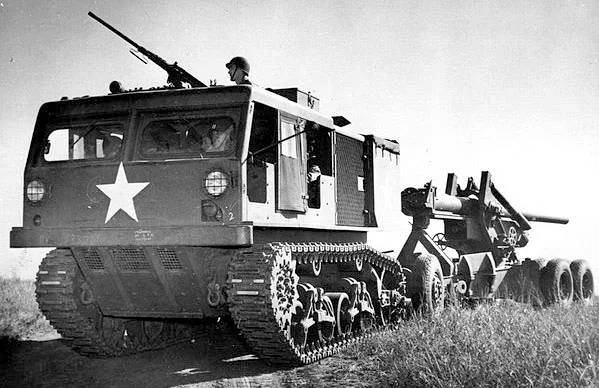 | M5 High Speed Tractor towing a 155 Howitzer M1. |