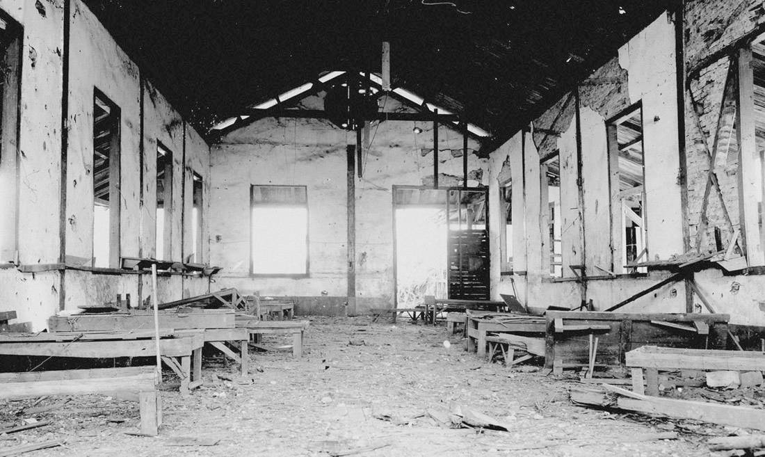 | The interior of a dormitory at Palawan shows the wooden beds on which the American POWs slept. |