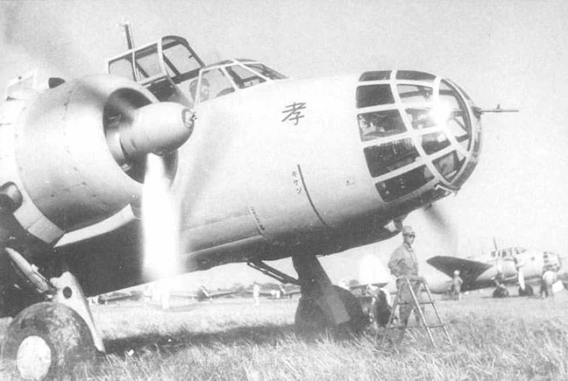 | Close-up of the nose of a Ki-48 light bomber, date unknown. |