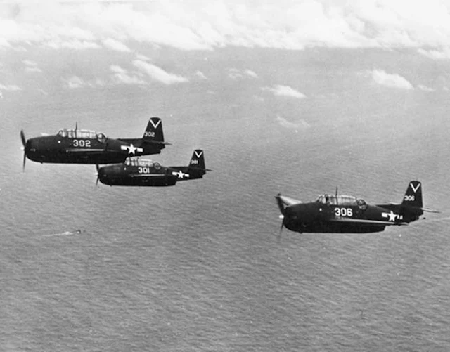 | TBM-3 Avengers of Torpedo Squadron VT-86 flying from USS Wasp (Essex-class), late August 1945. |