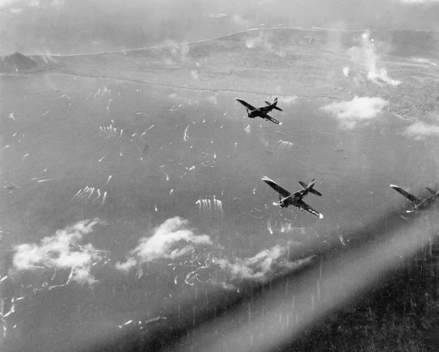 Douglas SBD Dauntless dive bombers on a combat mission off New Georgia Island in the Solomon Islands, 16 January 1944.